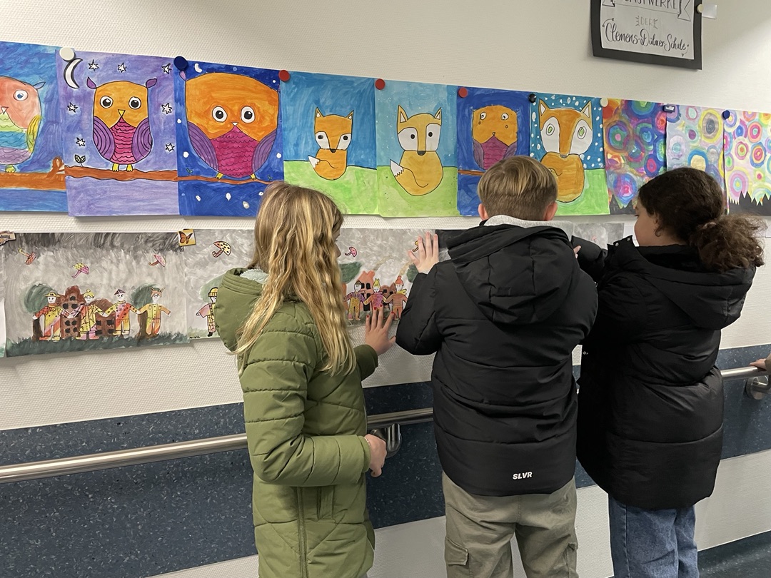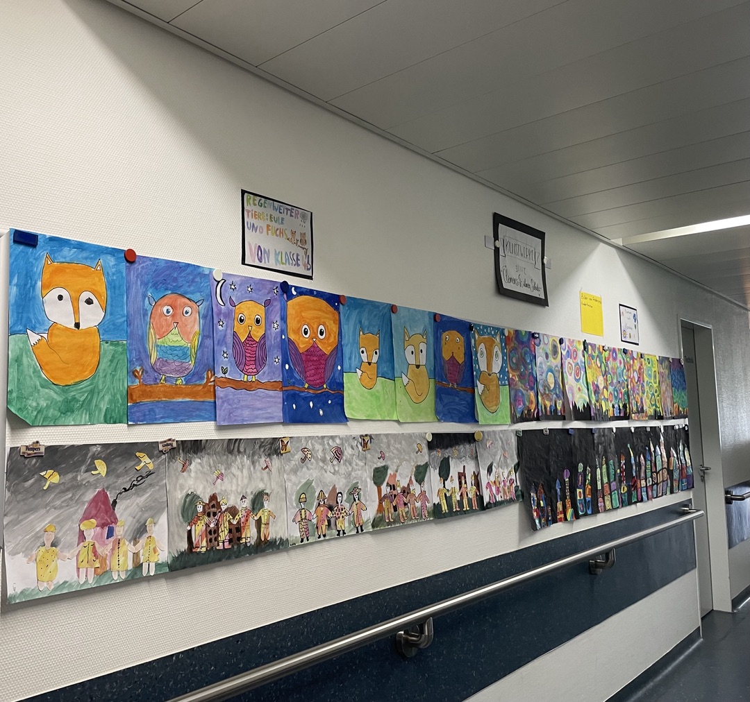 Eine Kleingruppe von Viertklässlern hat die ersten Kunstwerke der Jahrgangsstufe 4 dort aufgehangen. Sie bleiben dort eine zeitlang hängen und werden in regelmäßigen Abständen durch neue Kunstwerke ersetzt.